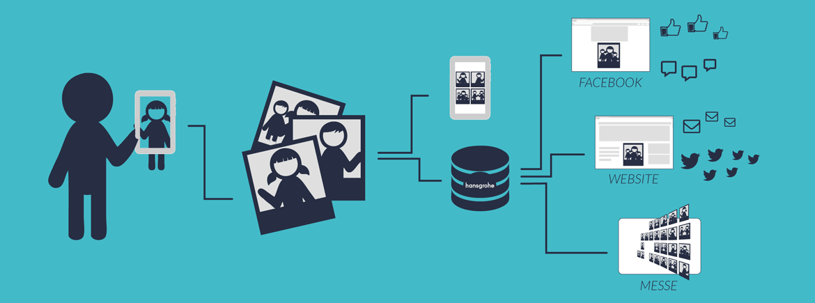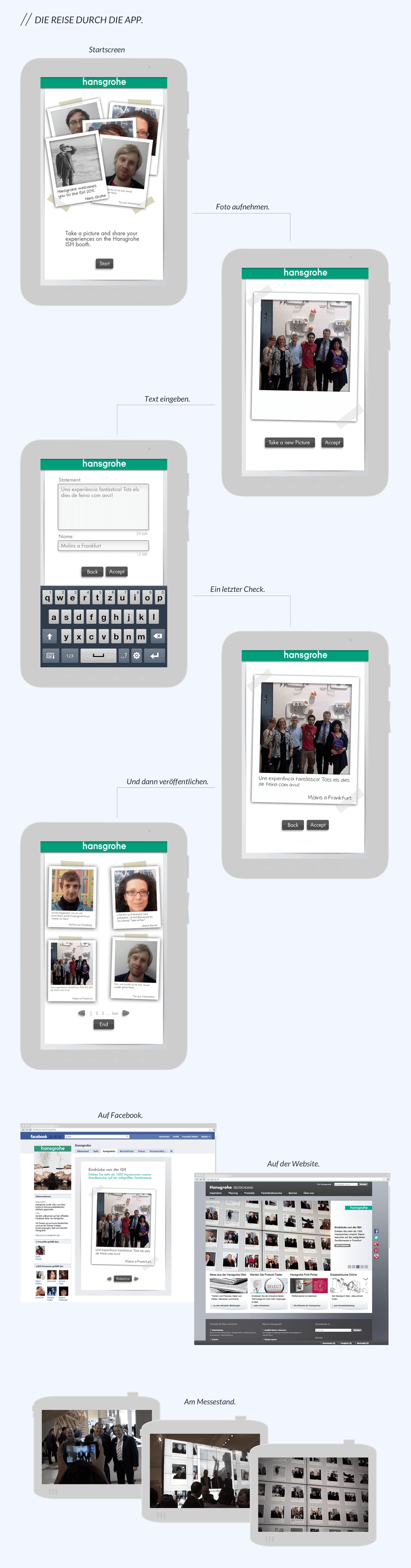 Hansgrohe macht klasse Produkte, keine Frage. Damit Messe- und Event-Besucher ihre persönliche Leidenschaft und ihre Erlebnisse auch teilen können, entwickelten wir die „Hansgrohe Footprint App“ für Android Devices. Einfach mit dem Messe-Tablet ein Foto machen, kurzen Text schreiben und schon entsteht ein persönlicher Fußabdruck. Dieser erscheint automatisch auf einem 20-qm Messe-Screen und wird direkt auf Facebook und der Hansgrohe-Website veröffentlicht. Wer mag, kann den Fußabdruck dann später liken, sharen, tweeten oder per Mail verschicken.