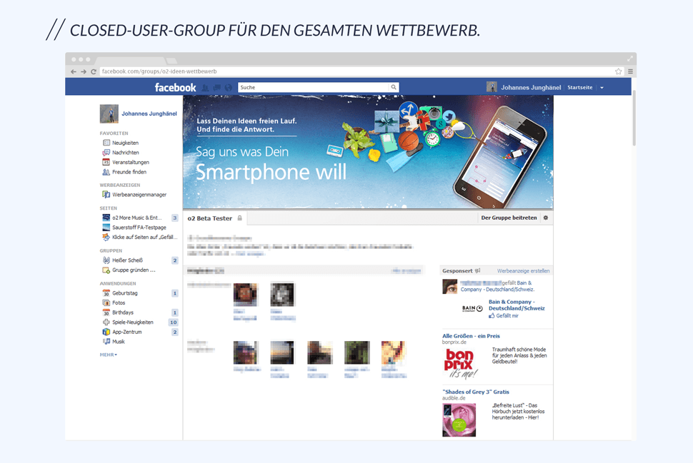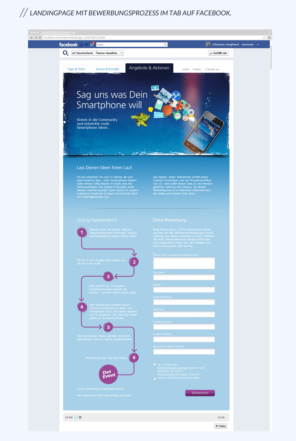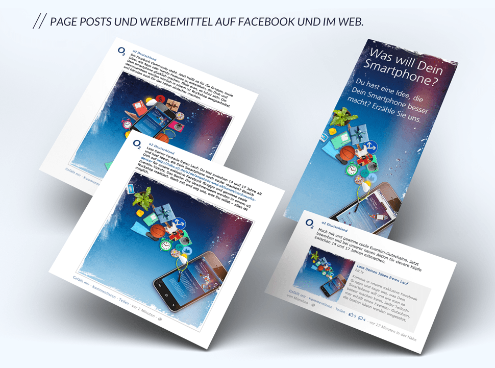 Sag uns was dein Smartphone will – unter diesem Motto starteten wir für o2 einen Nachwuchsdenker-Wettbewerb auf Facebook. Jugendliche konnten sich mit einer Idee zur Smartphone-Zukunft für eine Closed-User-Group direkt auf Facebook bewerben. In mehreren Phasen wurden die Ideen ausgearbeitet und bewertet. Die besten Ideen schafften es zu einem Workshop bei o2 im Hause.