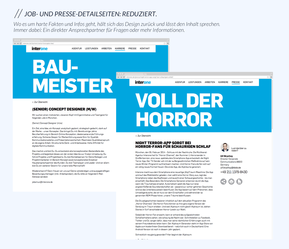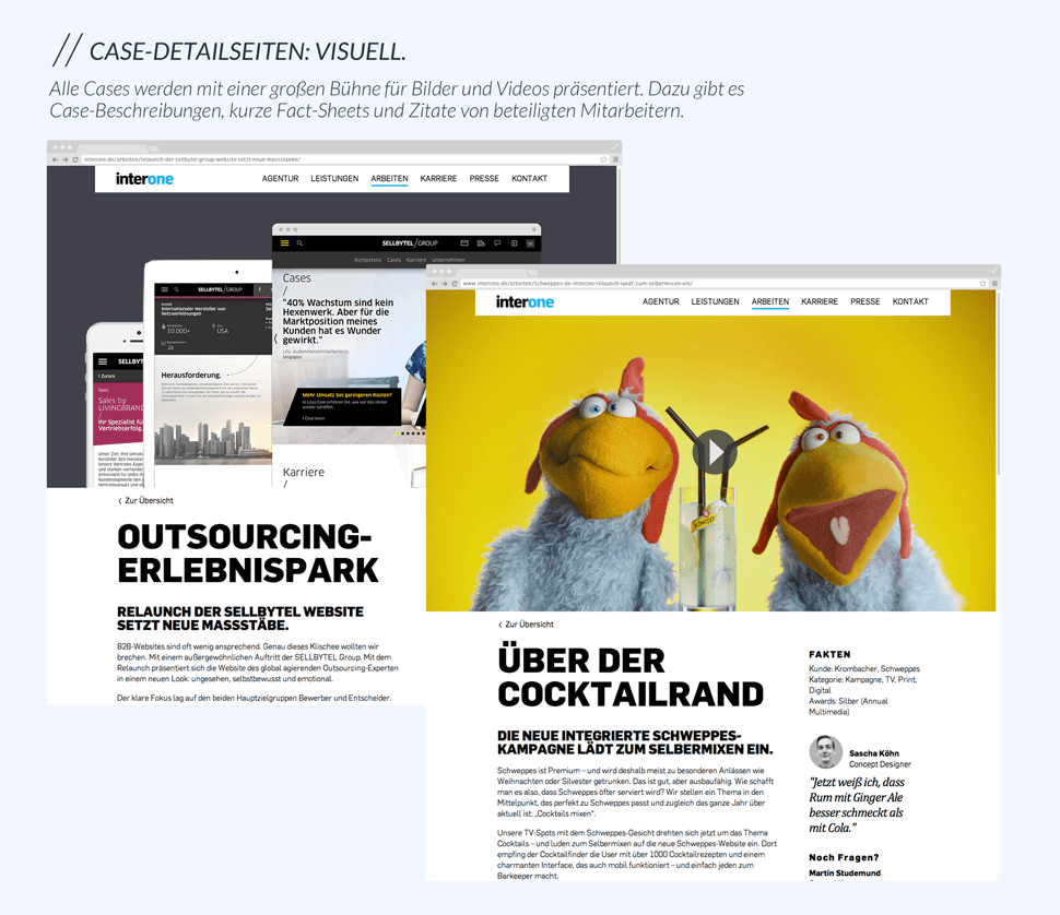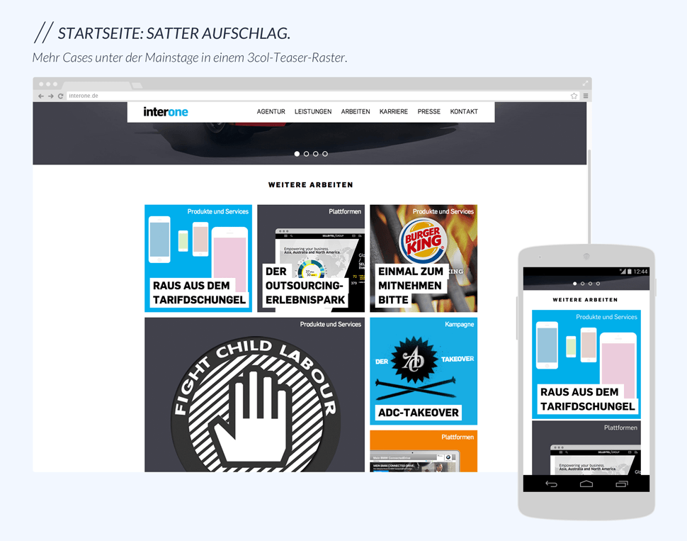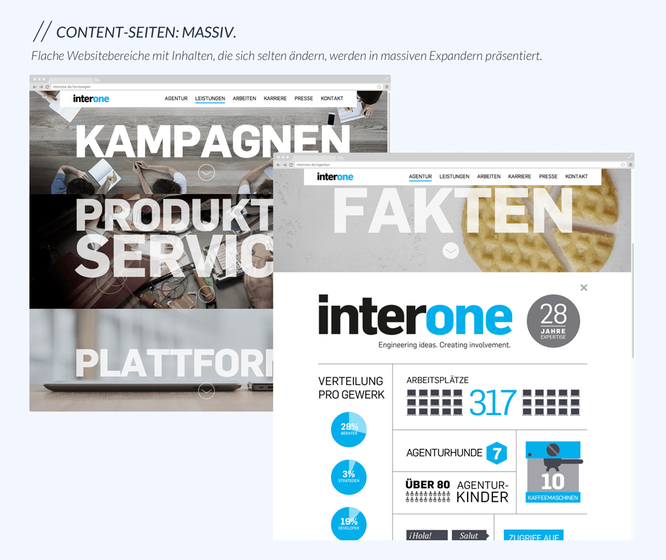 Interone ist eine Multikanal-Agentur mit digitaler DNA. Kreative Kampagnen,  Services mit Mehrwert und performante Plattformen zeichnen die Arbeit der 350 Mann starke Truppe aus. 2014 war es Zeit für eine neue Seite, die der DNA und der Ausrichtung gerecht wird. Authentisch, Entertaining, Bold & Responsive war die Ansage.